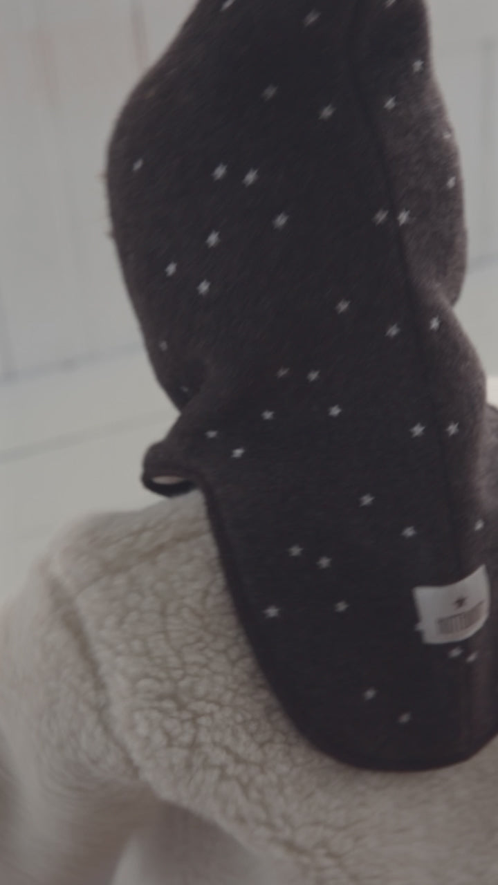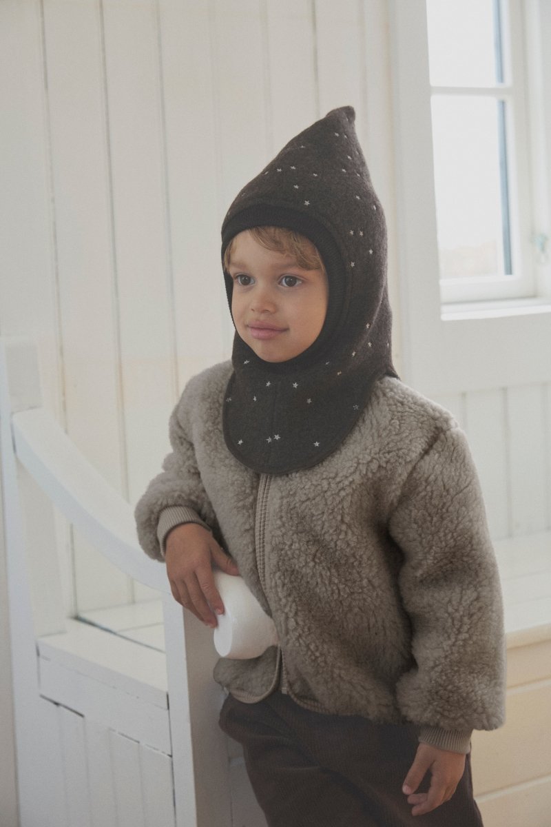 Urocza kominiarka wełniana z podszewką , ozdobiona subtelnymi haftami na całej powierzchni. Kominiarka ma szpiczasty kształt głowy oraz szeroki, elastyczny ściągacz wokół twarzy, który zapewnia idealne dopasowanie i dobrą ochronę. Dzięki praktycznemu krojowi z przedłużonym tyłem chroni również szyję przed chłodem. Wykonana z przyjemnej mieszanki wełny, z miękką welurową podszewką wewnątrz.
