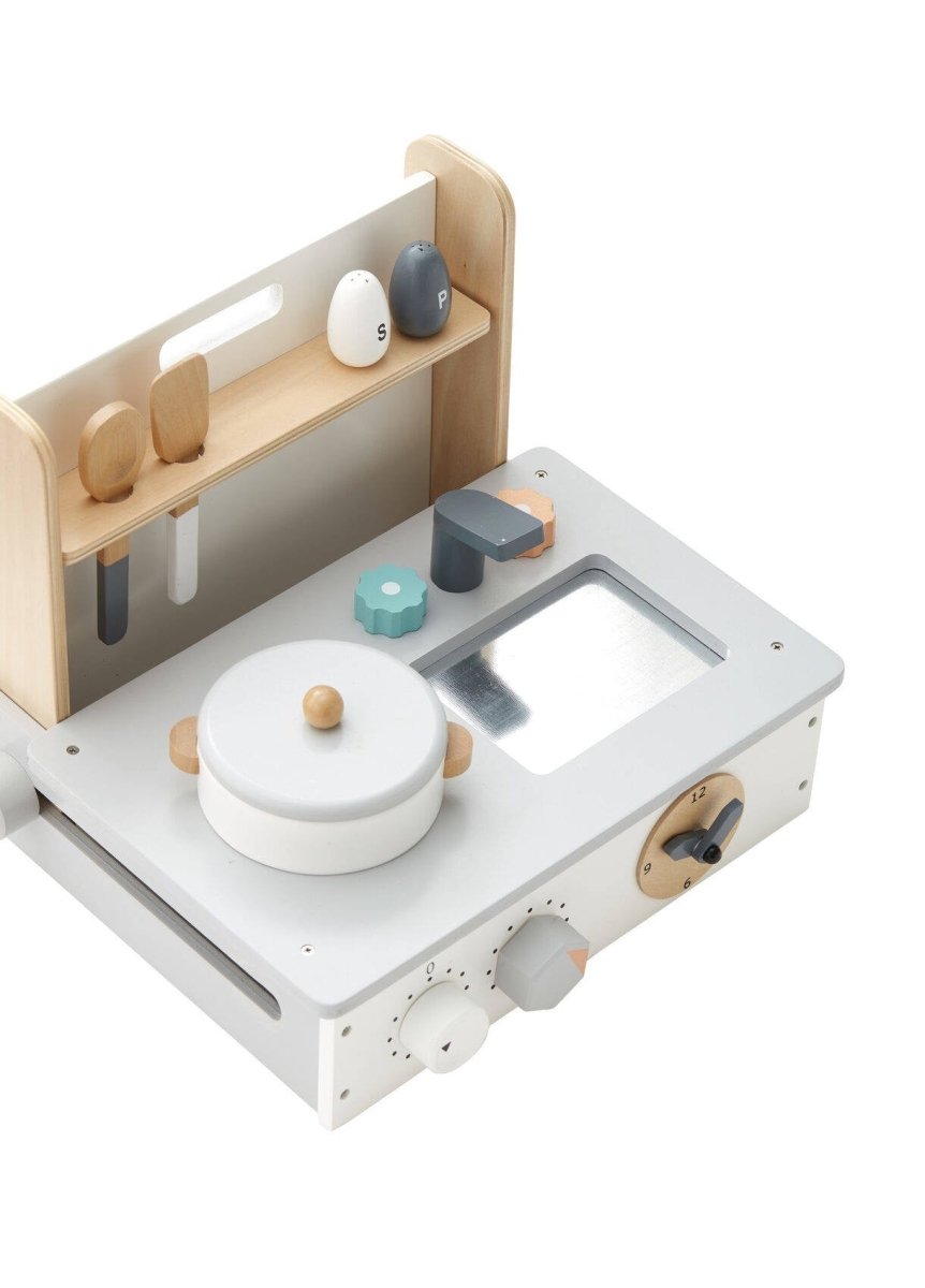 Zestaw zawiera chochlę, szpatułkę, rondel, patelnię, solniczkę i pieprzniczkę. Uchwyt ułatwia przenoszenie kuchni po złożeniu. Wszystkie akcesoria ładnie zapakowane w środku.