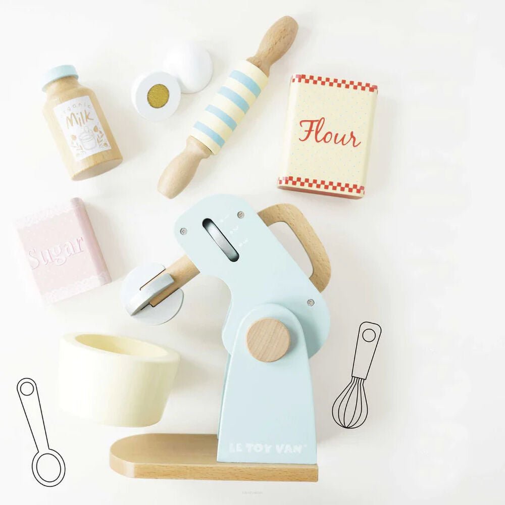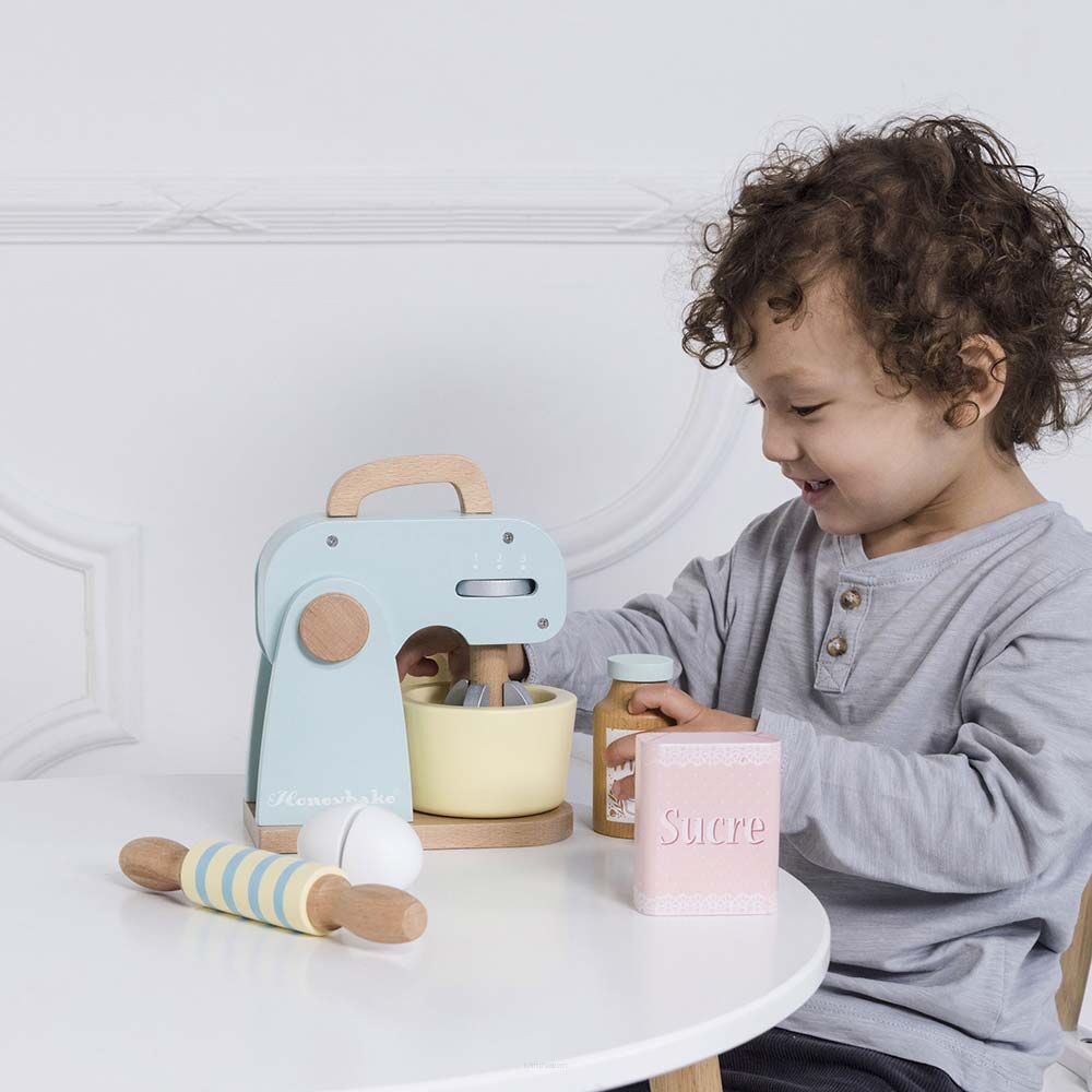 Zestaw drewnianych zabawek zawiera mikser z realistycznie poruszającym się mieszadłem, drewniany wałek, miskę, mleko, mąkę, cukier i jajko. Ta urocza zabawka w stylu retro ma pastelowe kolorach i szereg funkcji, które sprawiają, że zabawa jest bardzo realistyczna.