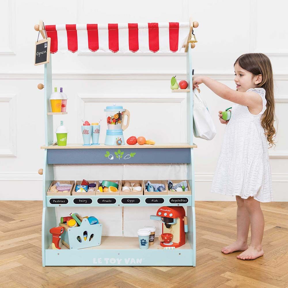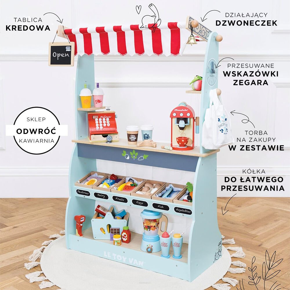 Zabawa w sklep to jedna z ulubionych zabaw dzieci, która rozwija umiejętności społeczne, mowę, zdolność do dzielenia się oraz do czekania podczas zabawy. Sklep i kawiarnia 2w1 stanowi wyjątkowy i przemyślany prezent na każdą uroczystość. Poznaj akcesoria dla małych sprzedawców i klientów z oferty marki Le Toy Van sprzedawanych oddzielnie.