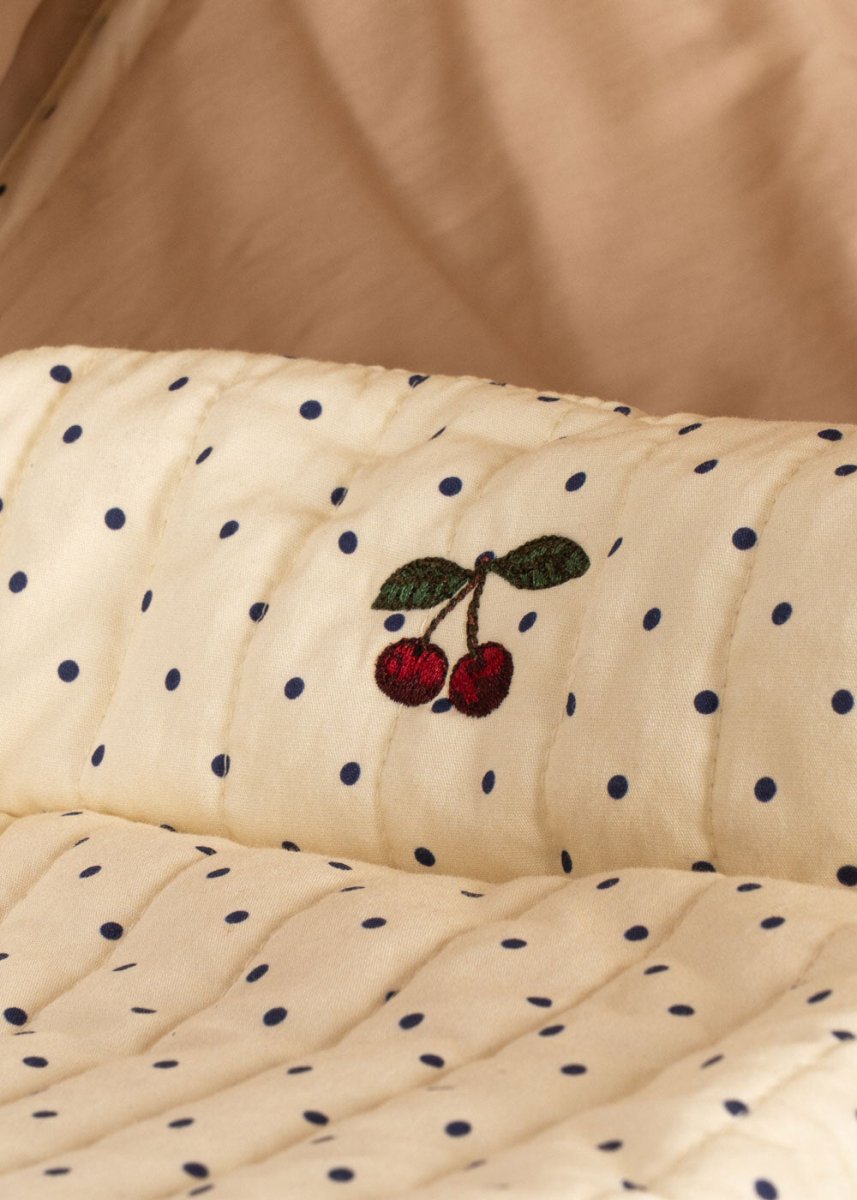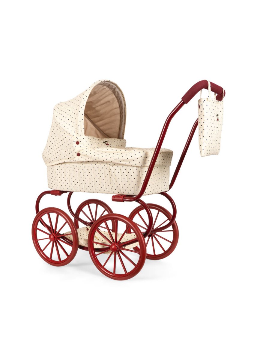 Wózek dla lalek gondola w stylu vintage od Konges Slojd w mniejszej wersji, odpowiedni dla dzieci w wieku od jednego do trzech lat. Zaprojektowany z czterema dużymi kołami, które zapewniają łatwe i stabilne chodzenie, pikowanym materiałem i delikatnymi krawędziami w kształcie muszelki.