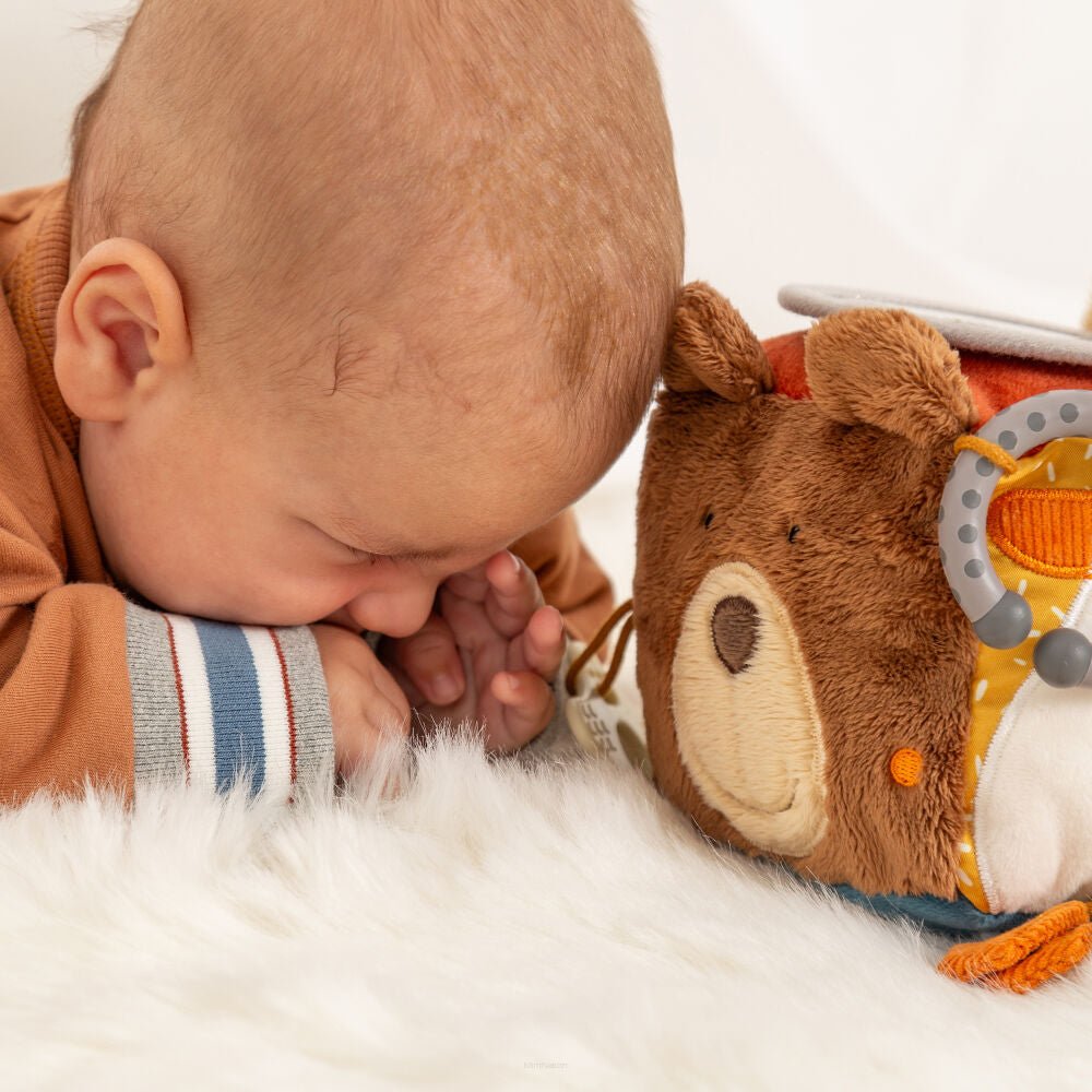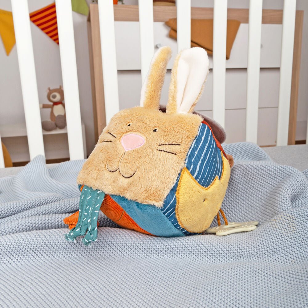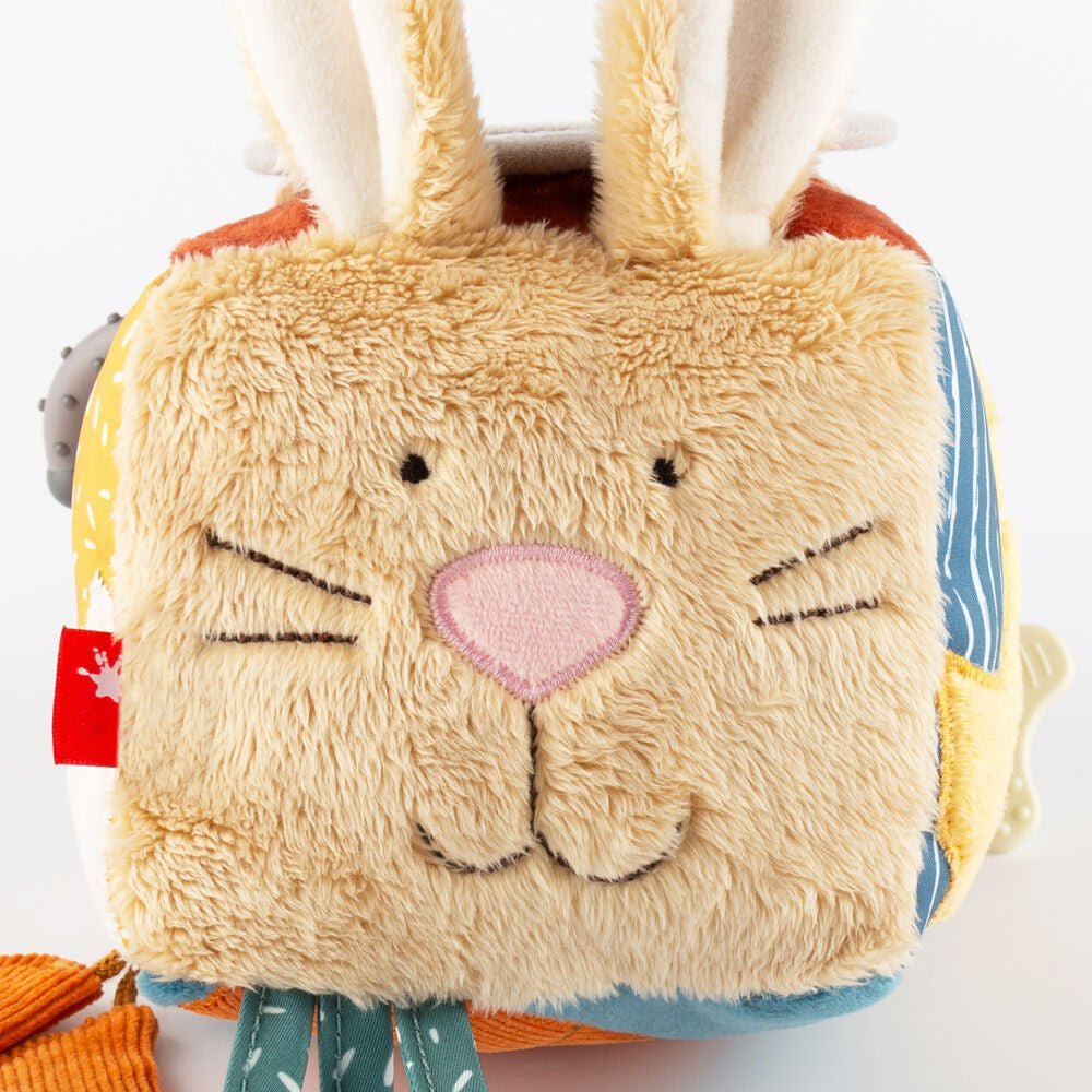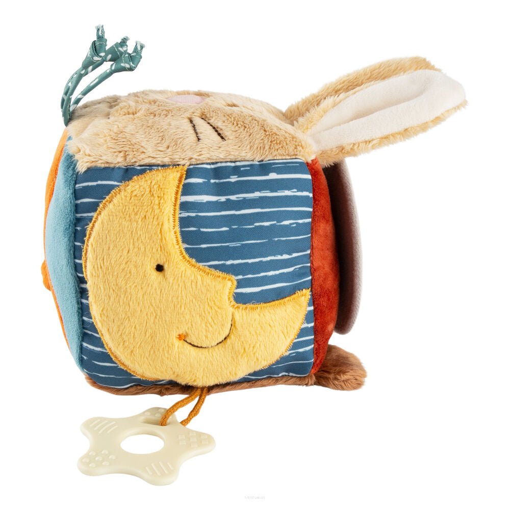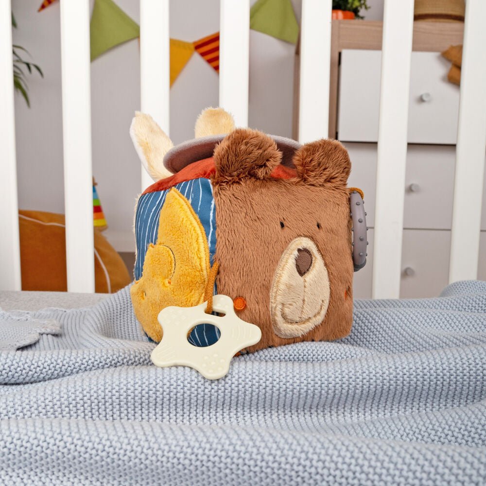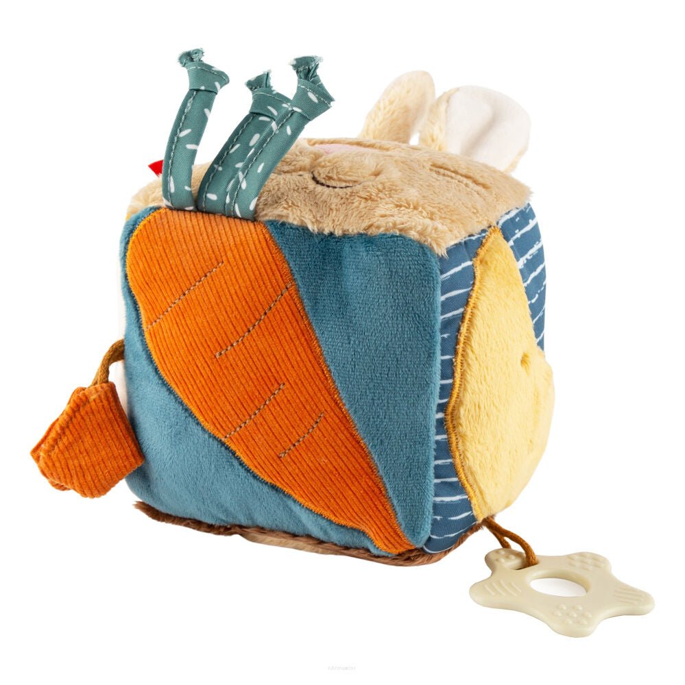 Ta rozwojowa zabawka zapobiega nudzie i zachęca dzieci do aktywnego chwytania, czucia i słuchania. Kostka zaprasza do eksplorowania, jest łatwa do uchwycenia i trzymania przez małe rączki. Różnorodne tkaniny i przyjazne aplikacje z wizerunkami zwierząt oferują nowe wrażenia wizualne i dotykowe.