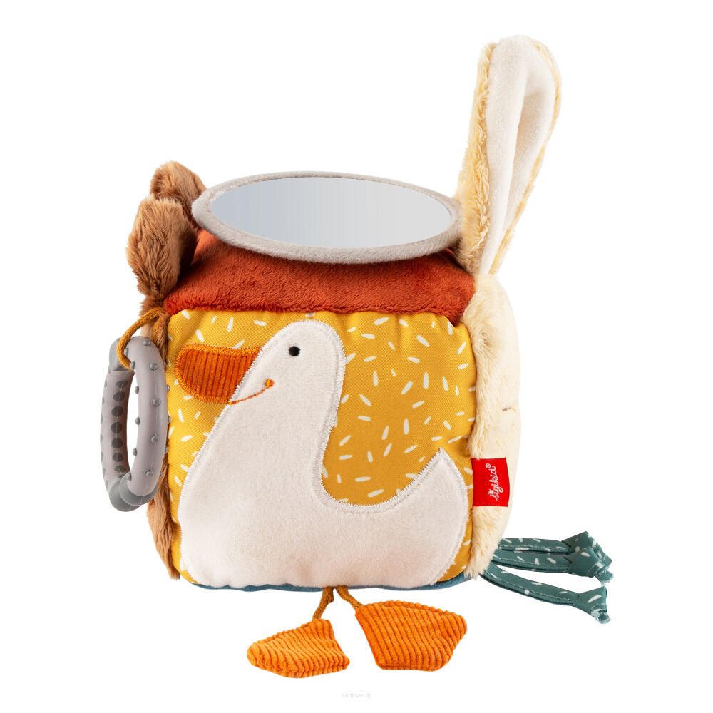 Kompaktowa mięciutka kostka to ekscytująca i pełna nowych możliwości zabawka. Różnorodne tkaniny i przyjazne aplikacje z wizerunkami zwierząt oferują maluchom nowe wrażenia wizualne i dotykowe. Kostka kryje również akustyczną niespodziankę: piszczałka, dzwonek i szeleszcząca folia ćwiczą słuch dziecka i nagradzają próby chwytania. Bezpieczne lusterko przymocowane na rzep zapewnia mnóstwo zabawy, a gryzaczek przynosi ulgę w okresie ząbkowania. Zabawkę można łatwo zawiesić na wózku, nosidełku lub łóżeczku.