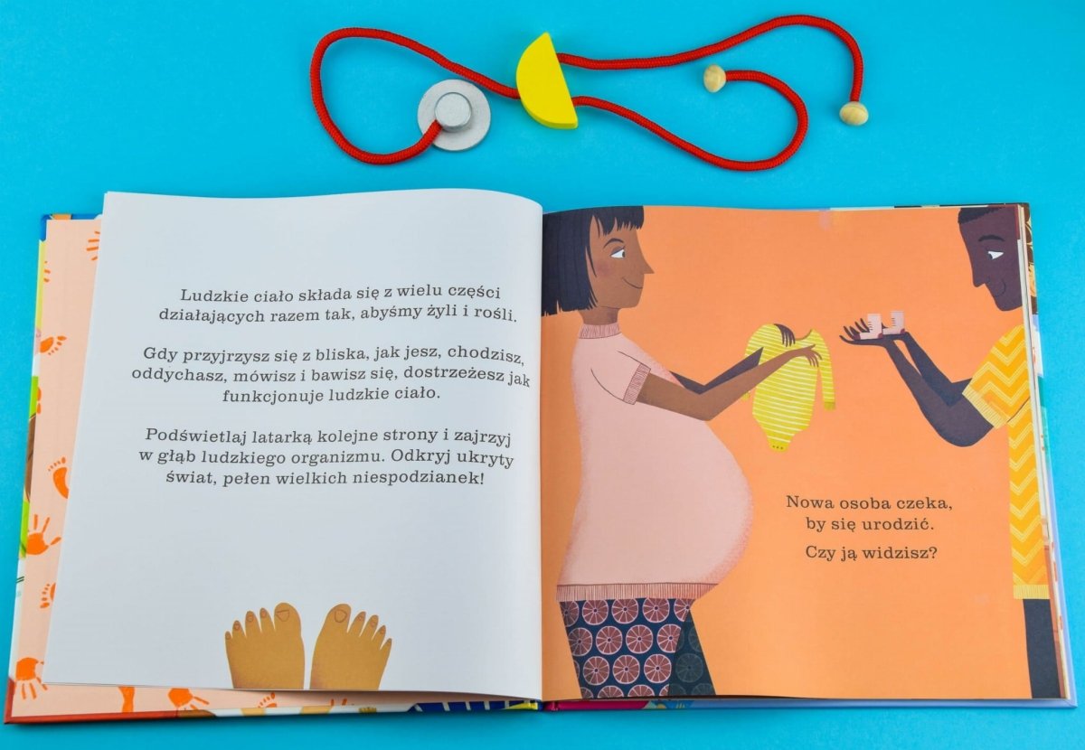 Ta niezwykła książka to doskonały wstęp do ludzkiej anatomii dla najmłodszych! Dzięki zastosowaniu specjalnej powłoki UV, latarka w rękach dziecka działa niczym rentgen. Wystarczy poświecić nią od tyłu na ilustracje lub spojrzeć pod światło, a naszym oczom ukażą się kolejne, ukryte wcześniej sceny.