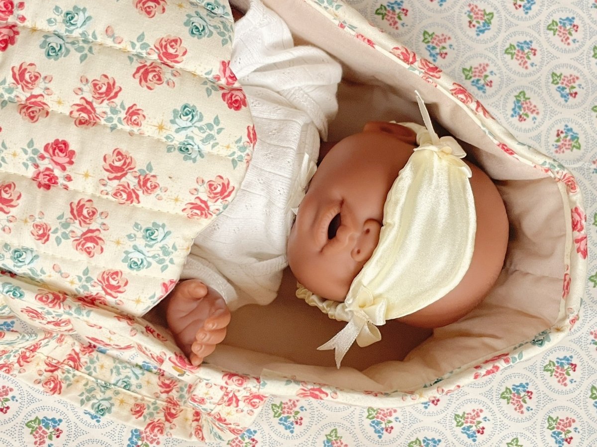 Lalka Lea w piżamce i opasce na oczy, z miękkim ciałem i ruchomą główką. W zestawie urocze nosidełko – idealna towarzyszka codziennych zabaw i podróży.