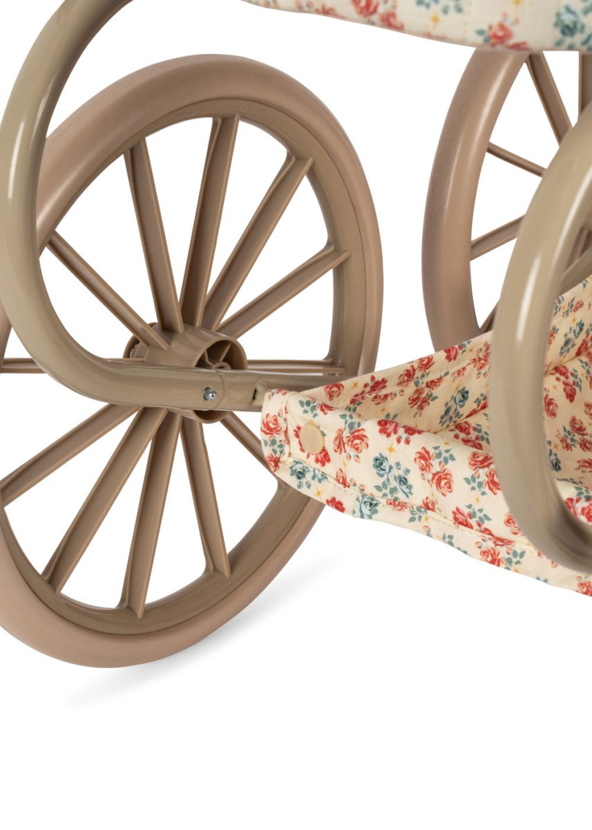 Wózek dla lalek gondola w stylu vintage od Konges Slojd w mniejszej wersji, odpowiedni dla dzieci w wieku od jednego do trzech lat. Zaprojektowany z czterema dużymi kołami, które zapewniają łatwe i stabilne chodzenie, pikowanym materiałem i delikatnymi krawędziami w kształcie muszelki.