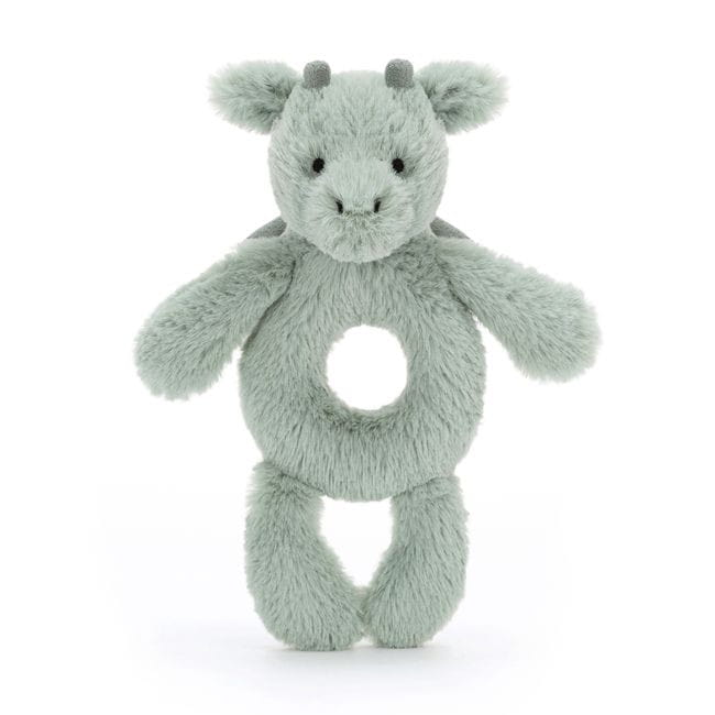 Bardzo miły i przyjemny w dotyku Smok marki Jellycat z grzechotką, którego można przytulać i ściskać. Ma urocze uszka i brzuszek w kształcie pączka z dziurką. Gotowy w każdej chwili na wesołą zabawę! Smok został uszyty z włókien pochodzących z recyklingu.
