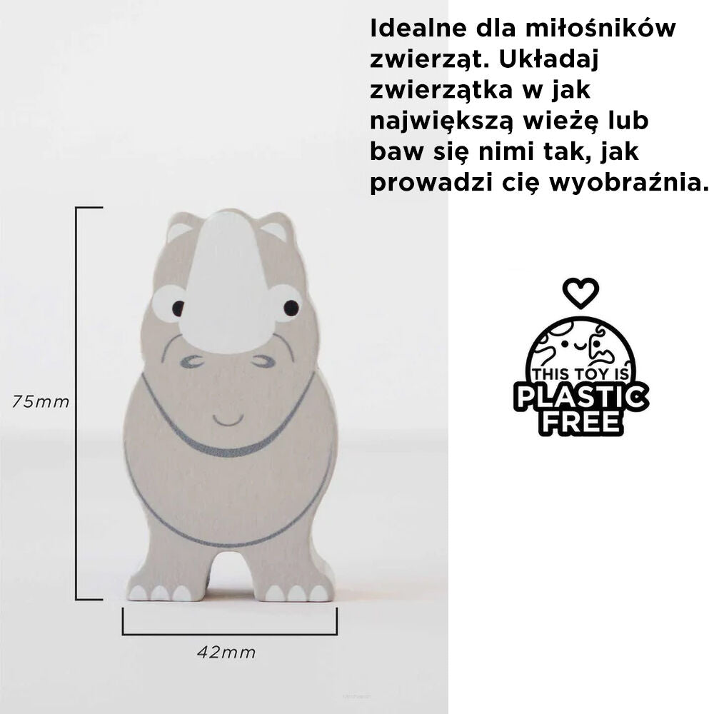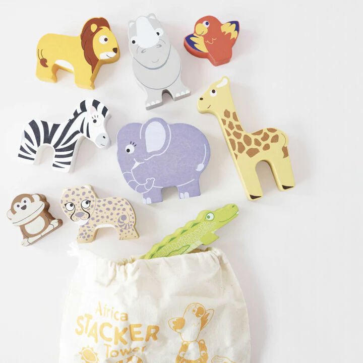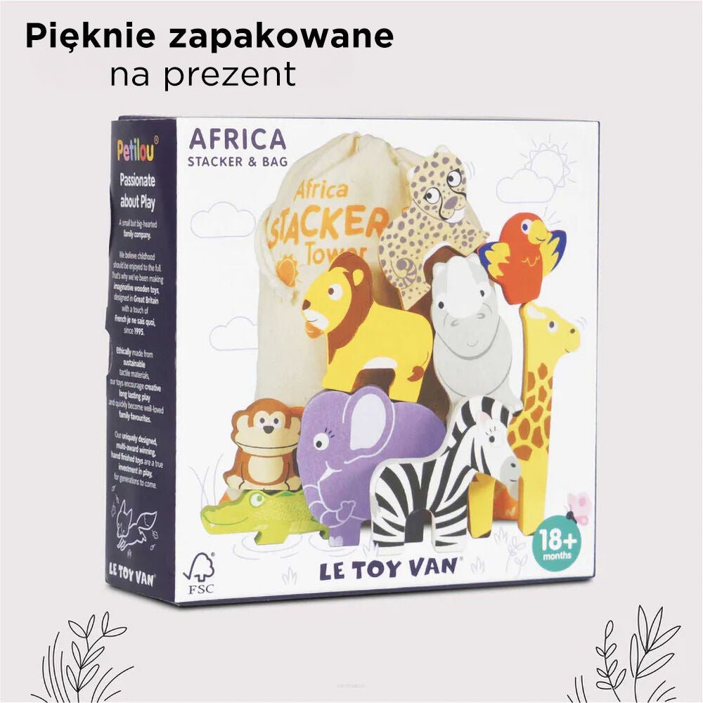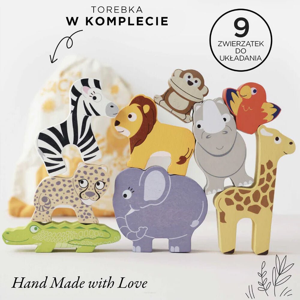 Zapakowany w bawełniany woreczek zestaw 9 drewnianych zwierzątek afrykańskich do układania pionowo i poziomo umożliwia zabawę w dowolnym miejscu. Ustawiaj zwierzątka i doskonal umiejętność koordynacji lub wykorzystaj je w pomysłowych scenariuszach innych zabaw. Zestaw obejmuje: żyrafę, lwa, słonia, zebrę, małpę, nosorożca, geparda, krokodyla i papugę. Układaj je jedno na drugim, aż się przewrócą!