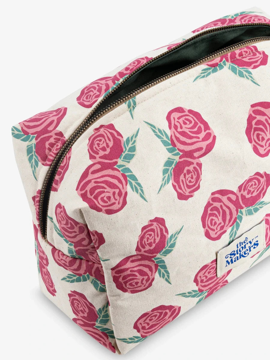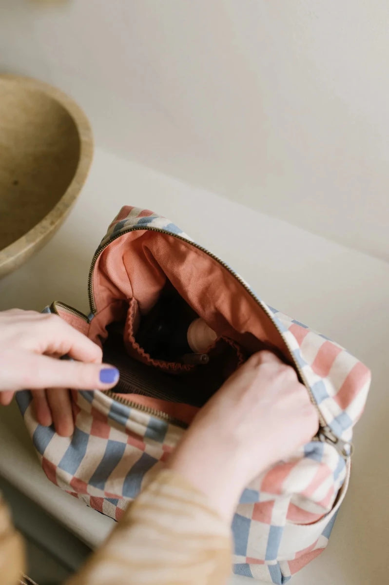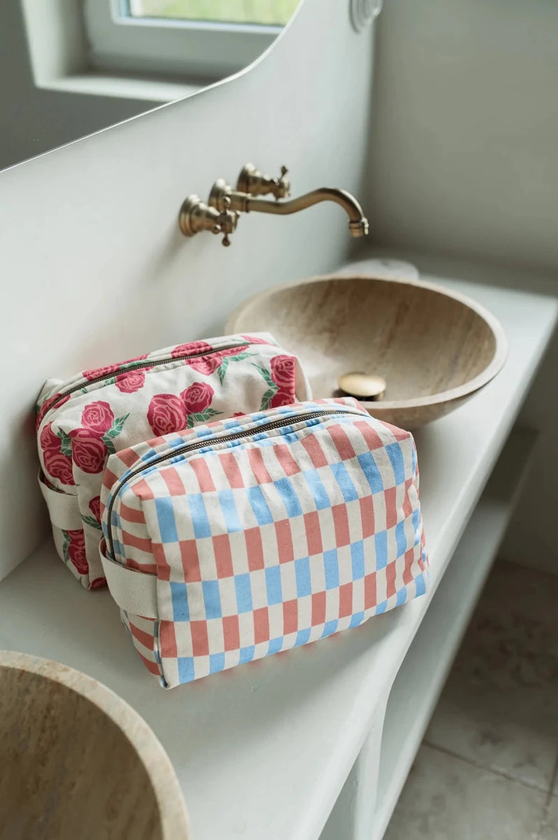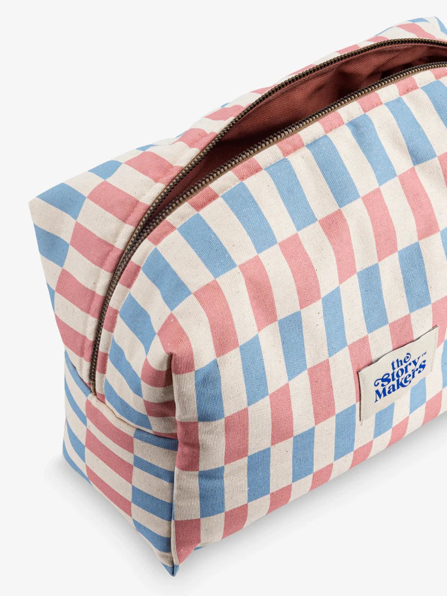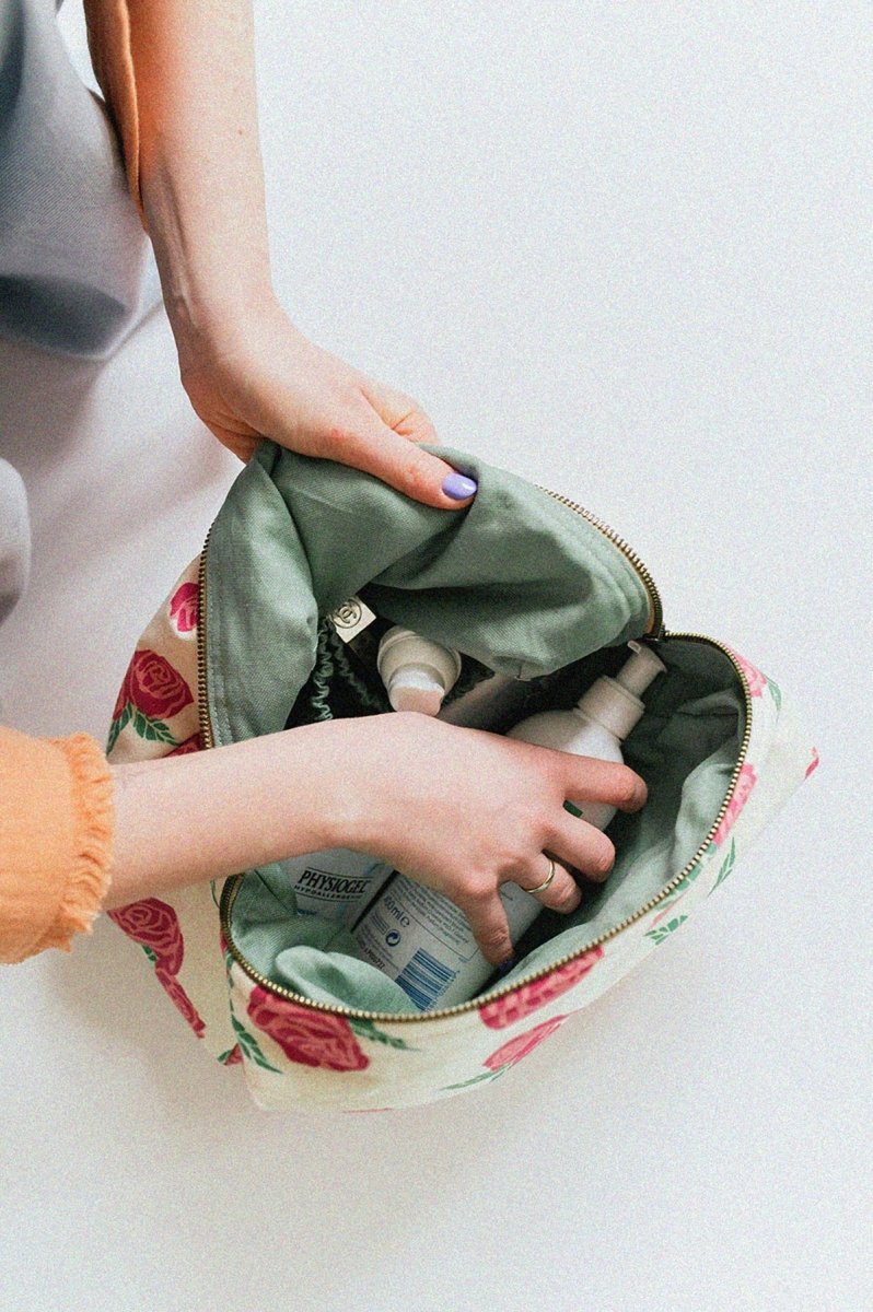 Miękka, maksymalnie pojemna bawełniana kosmetyczka z kontrastową podszewką z właściwościami wodoodpornymi. W środku dwie kieszonki na gumce dla lepszej organizacji, na zewnątrz bawełniana rączka oraz solidny, metalowy zamek.