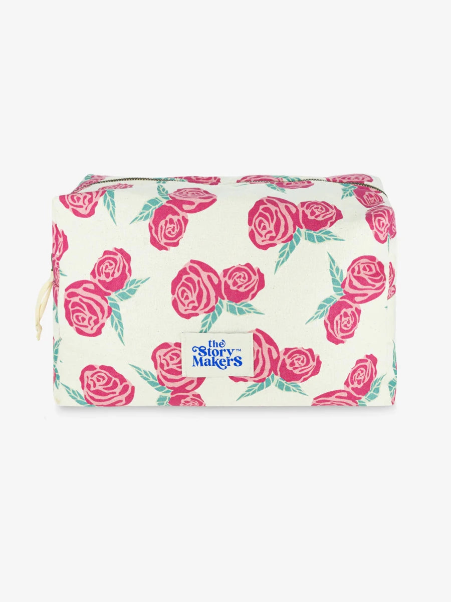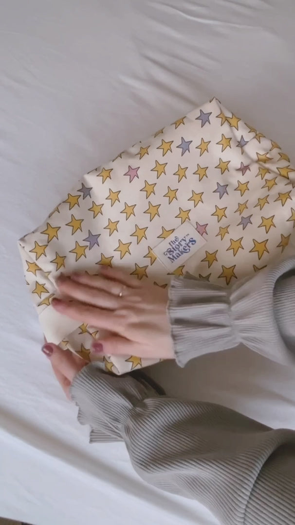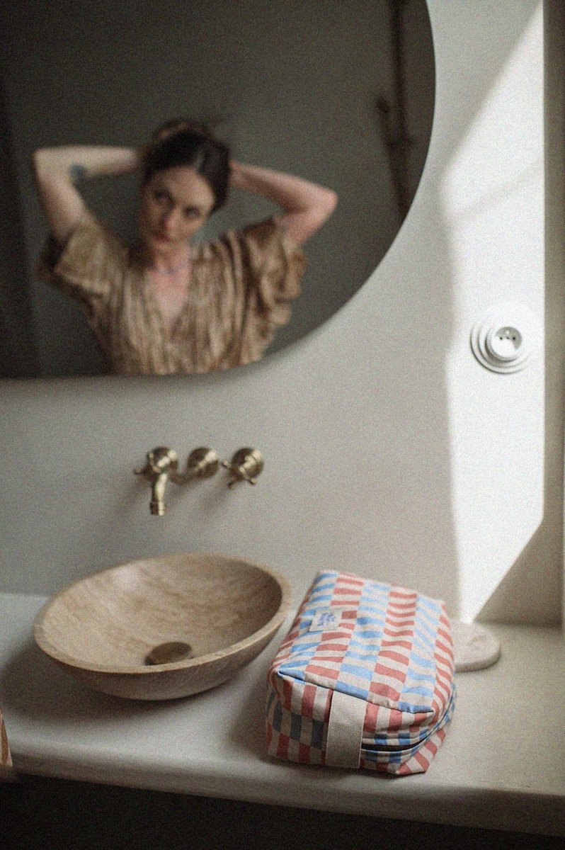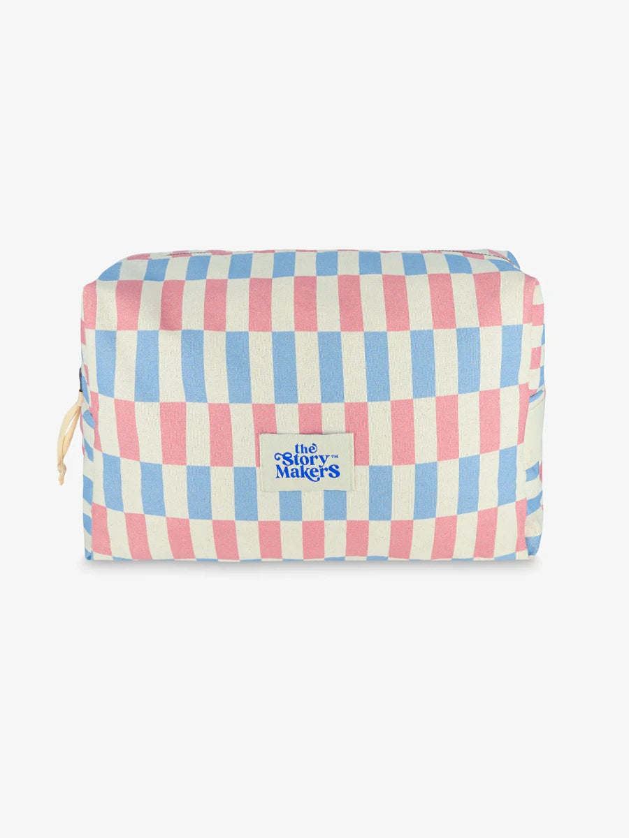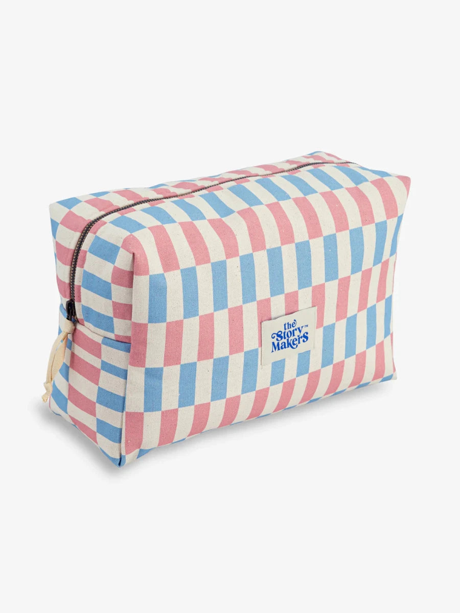 Miękka, maksymalnie pojemna bawełniana kosmetyczka z kontrastową podszewką z właściwościami wodoodpornymi. W środku dwie kieszonki na gumce dla lepszej organizacji, na zewnątrz bawełniana rączka oraz solidny, metalowy zamek.